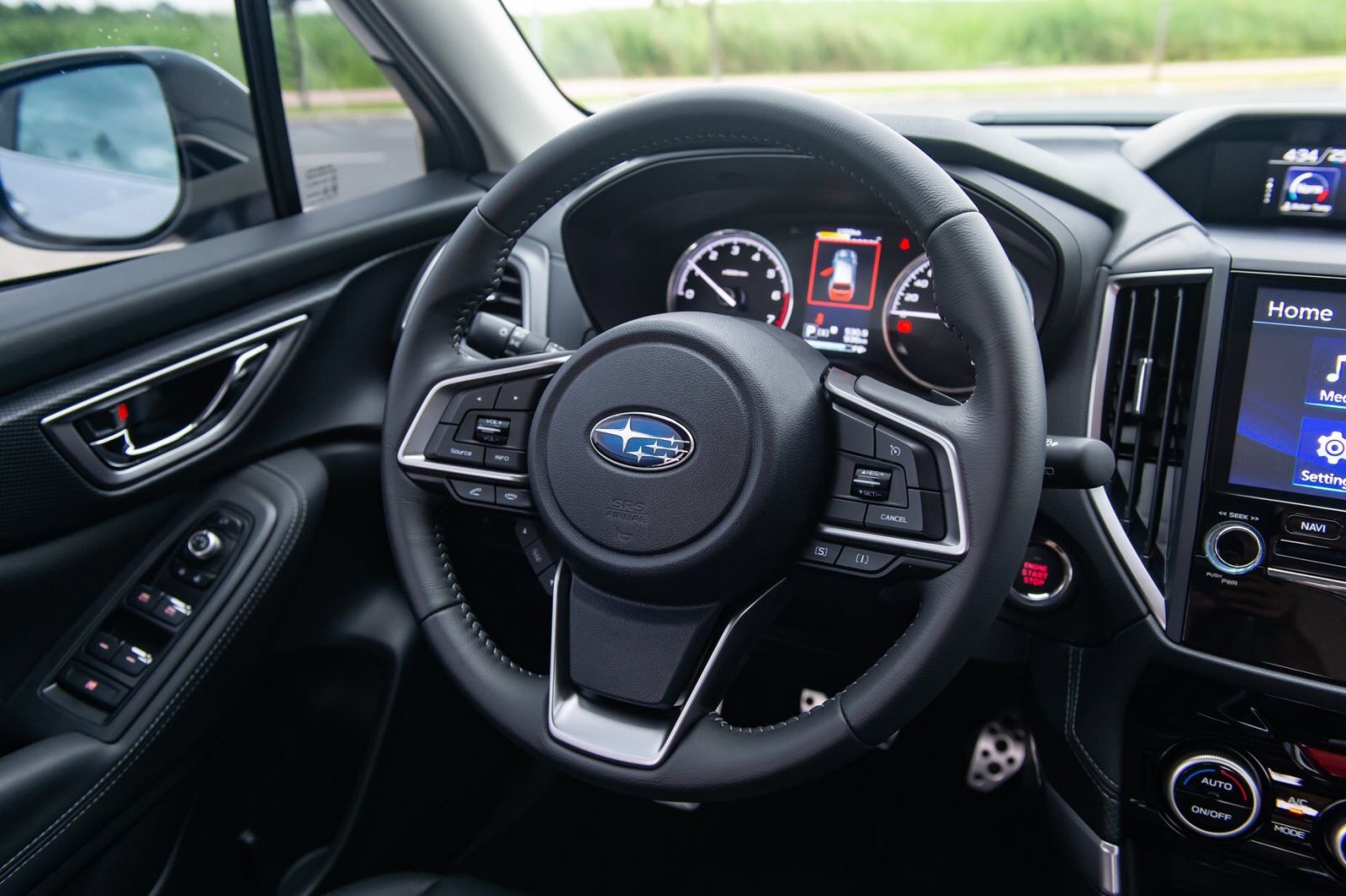 Phải thừa nhận rằng vô lăng của Forester 2.0i-S Eyesight quá đẹp trên phương diện thể thao, các nút bấm tiện lợi được sơn đen mờ toát lên vẻ mạnh mẽ. Những đường chỉ khâu được hoàn thiện rất tinh xảo. Ngay phía sau lẫy chuyển số giúp mang lại cảm giác lái chân thật hơn.